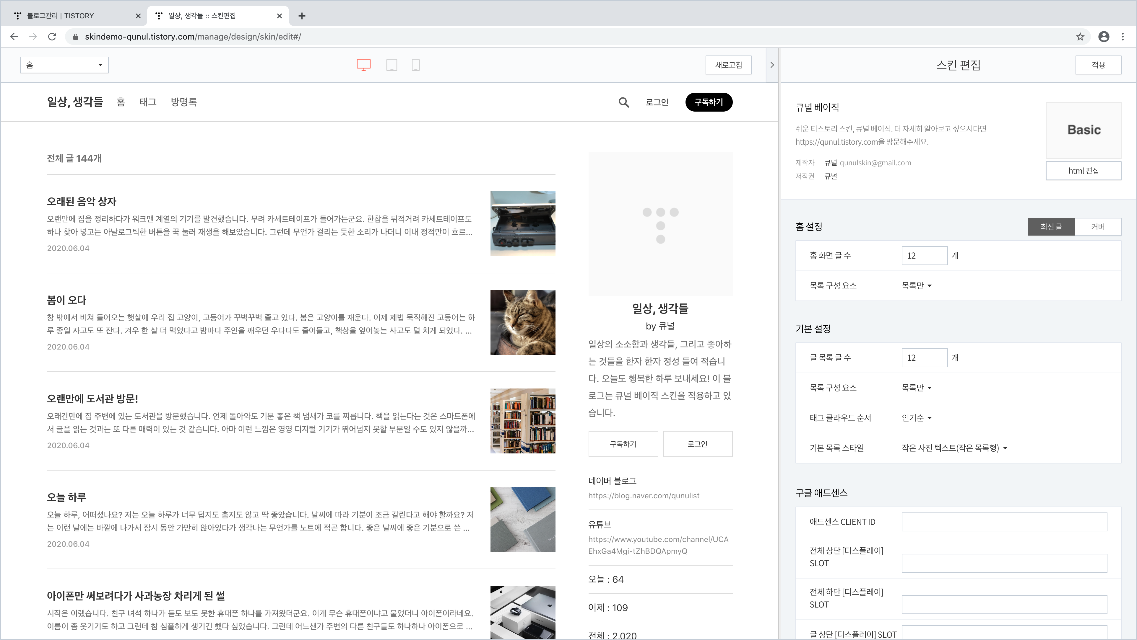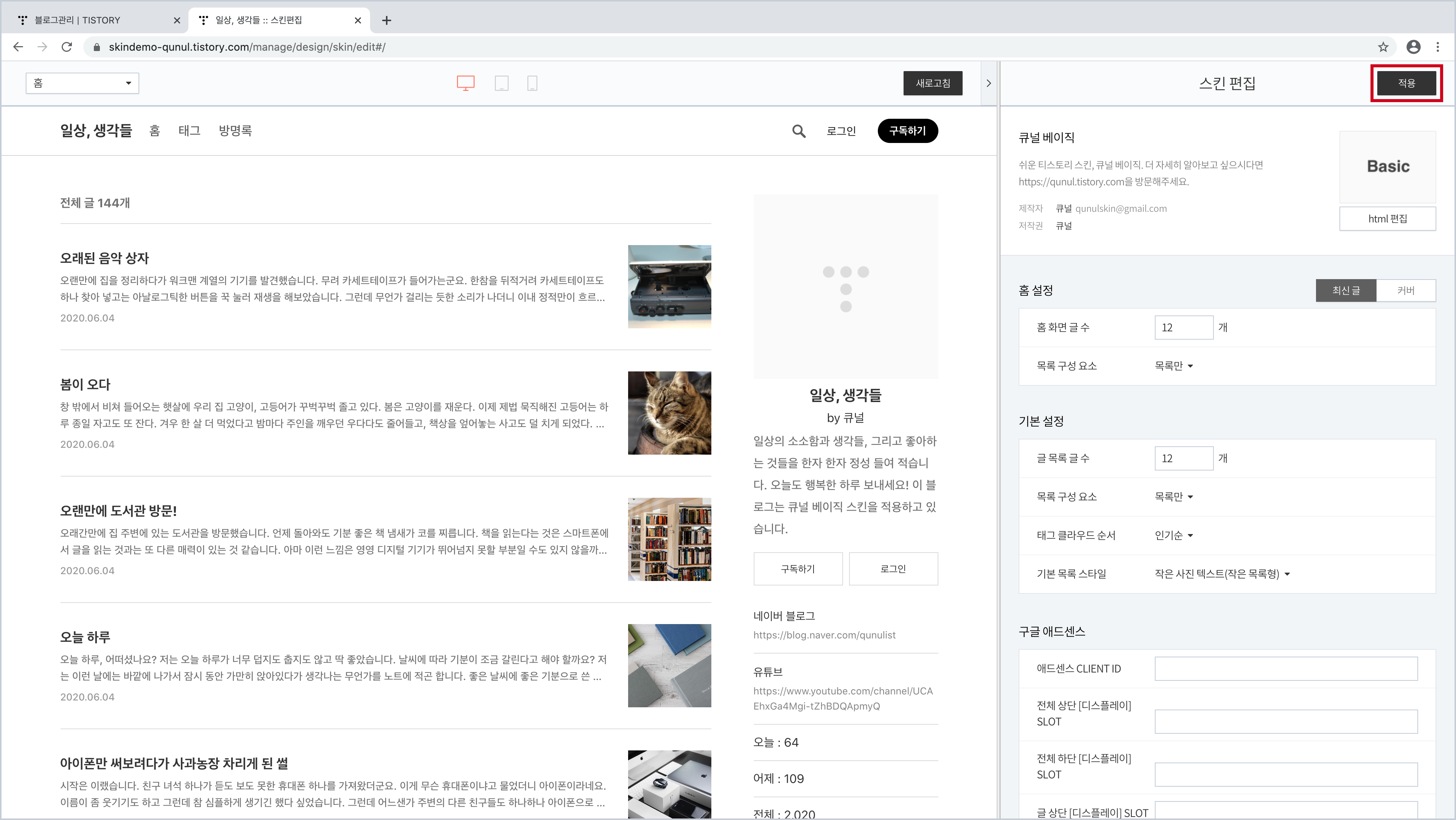 먼저, 큐널 베이직 스킨을 적용한 블로그의 관리 화면으로 갑니다.