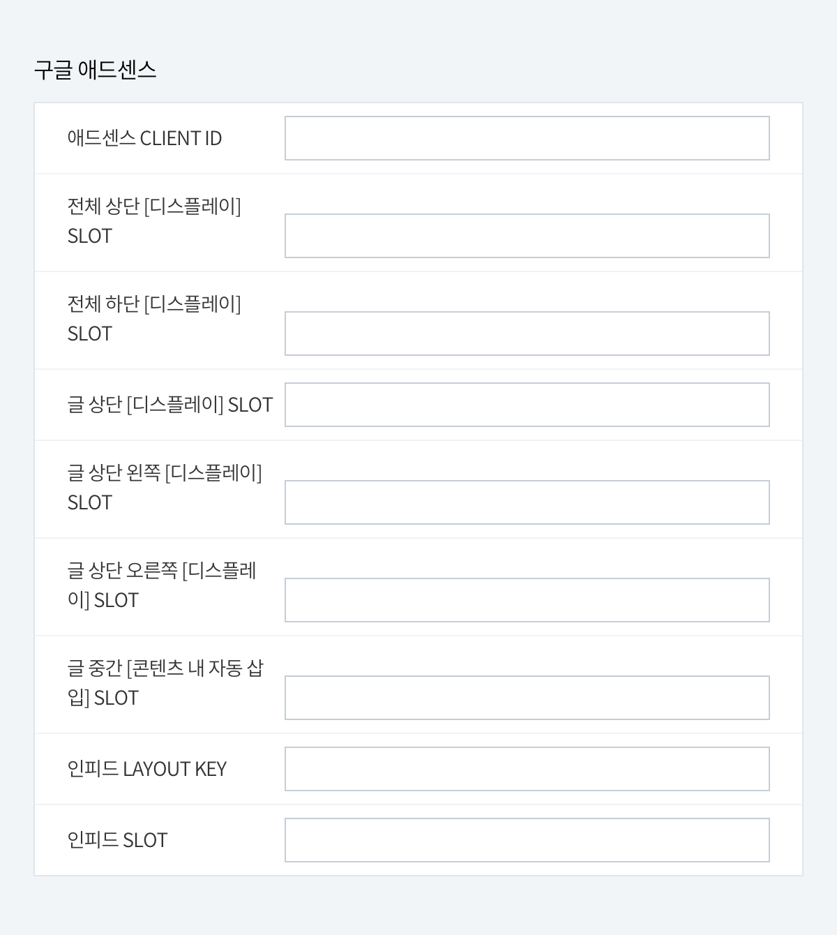 각각의 SLOT에는 광고 단위 코드의 data-ad-slot=" 다음에 오는 코드를 복사해서 붙여넣습니다.
