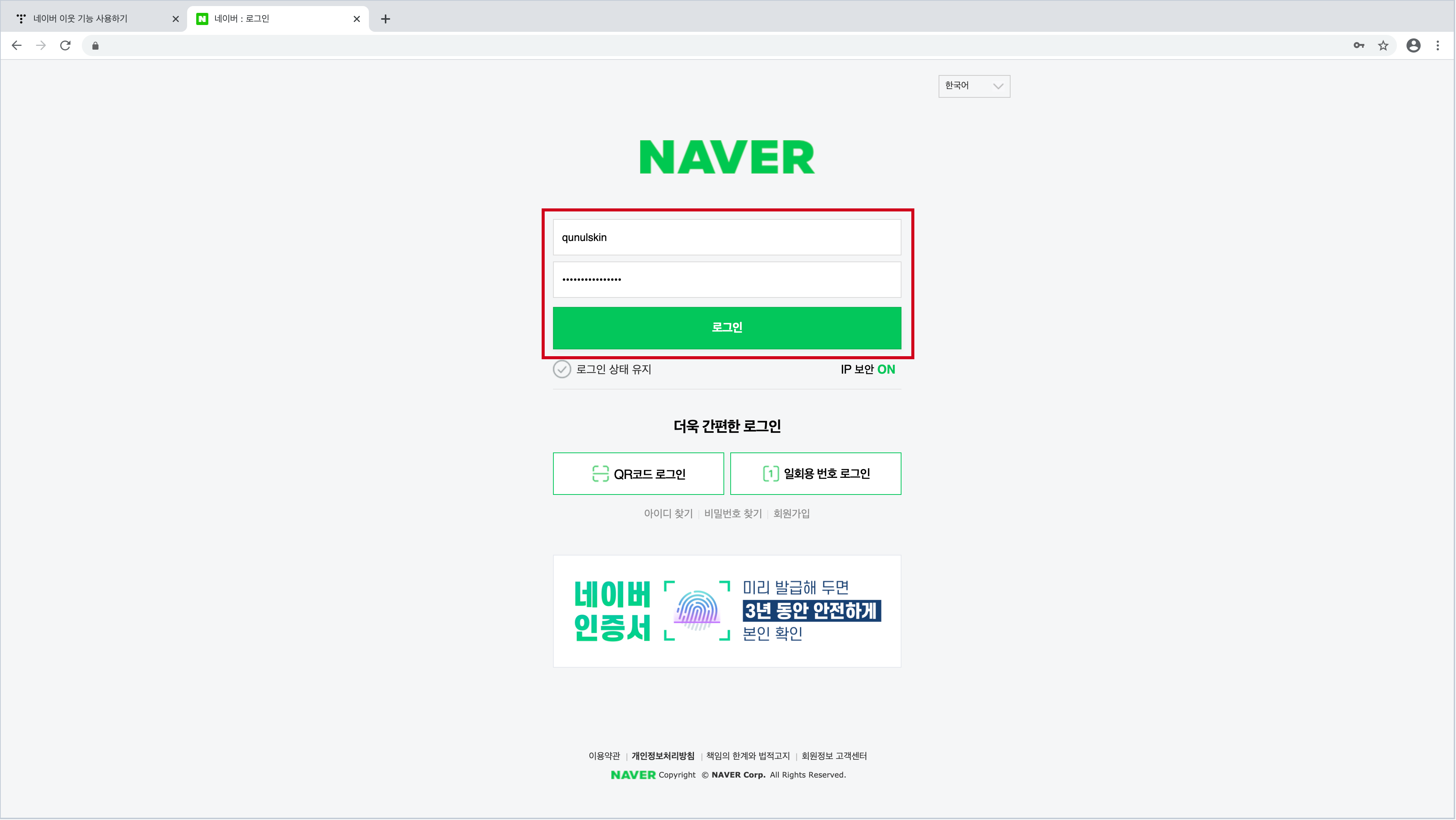 네이버 아이디에 내 네이버 아이디를 씁니다.