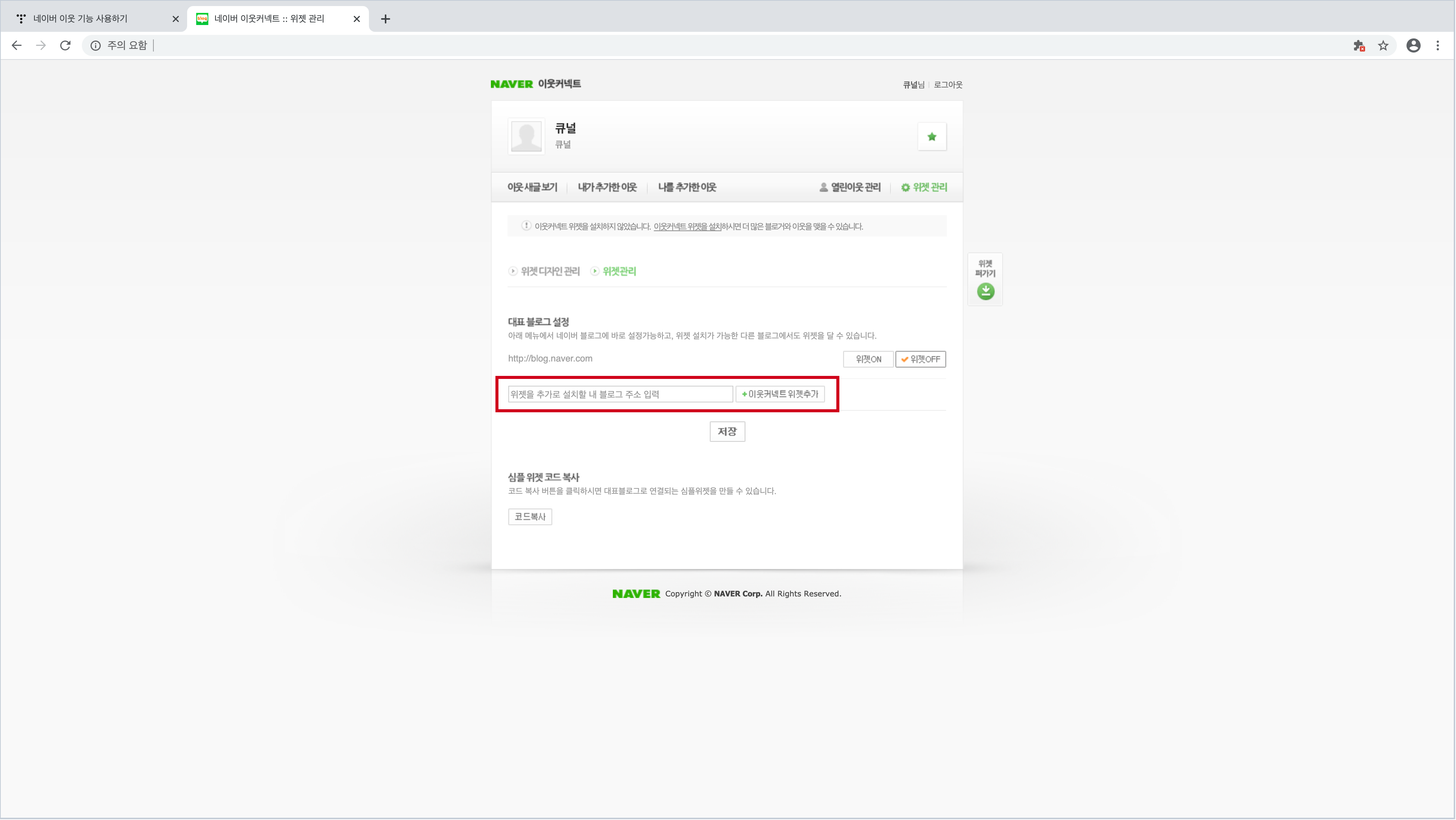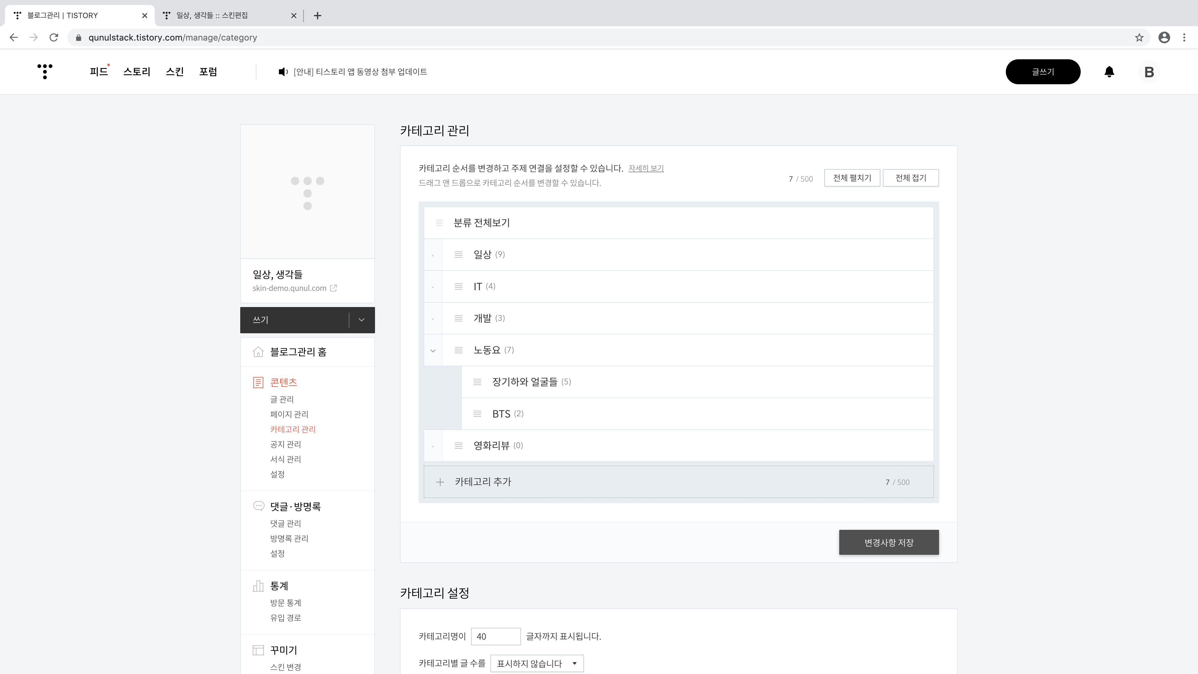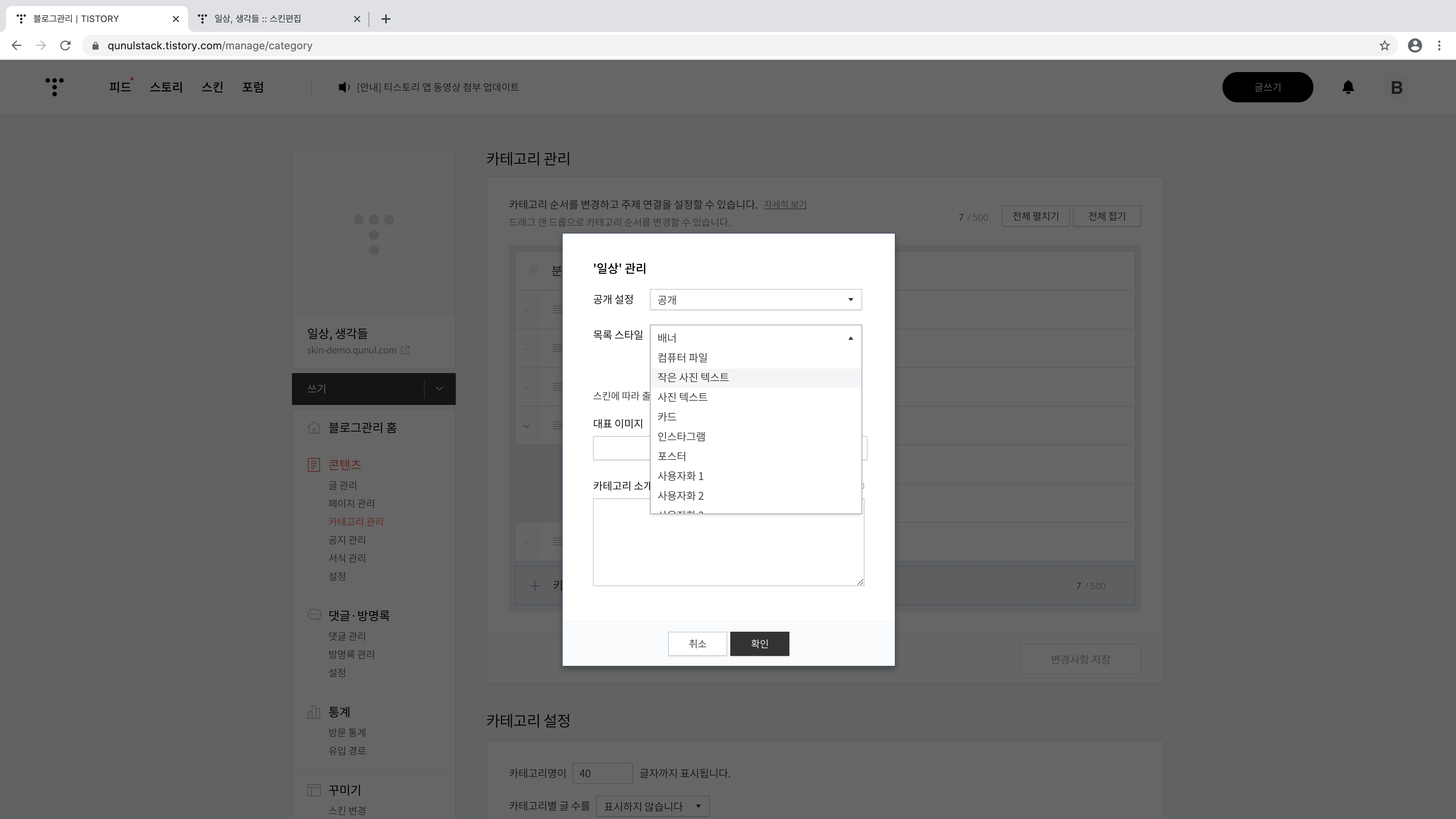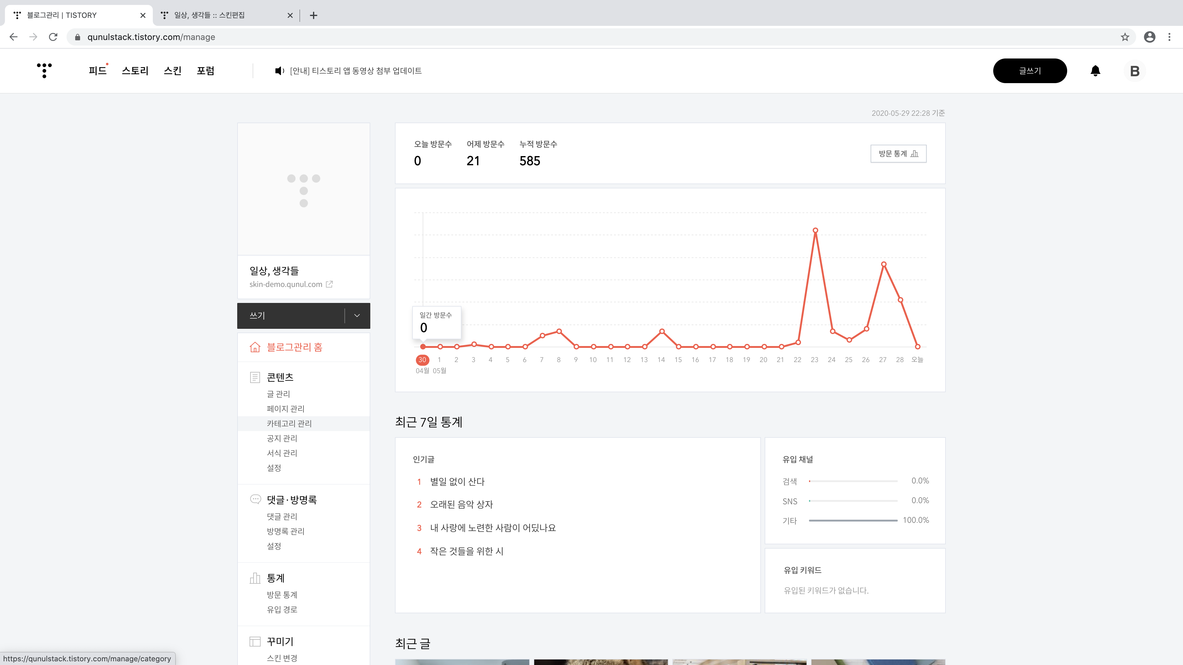 먼저, 큐널 베이직 스킨을 적용한 블로그의 관리 화면으로 갑니다.