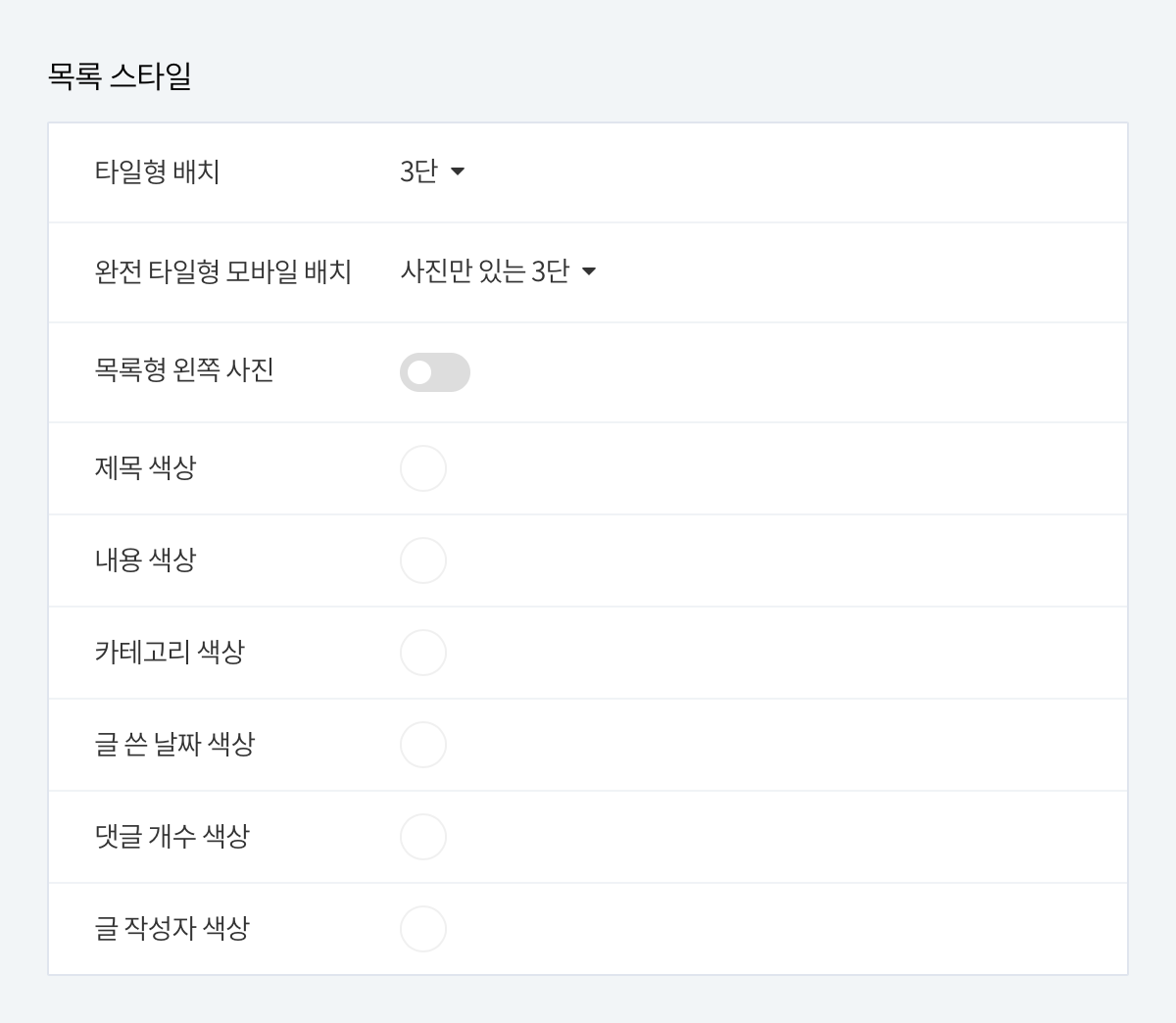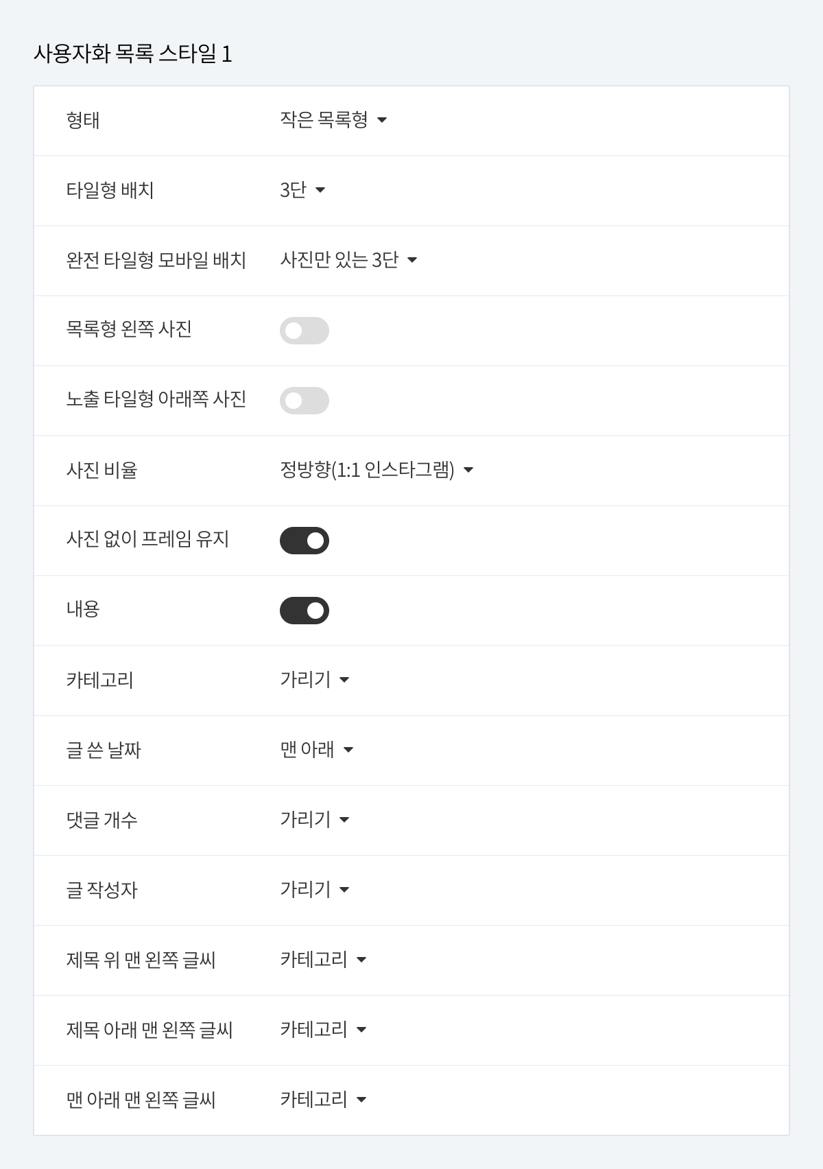 목록 구성 요소를 내용만으로 설정했을 때 메인 섹션의 모든 글 목록에 기본적으로 적용되는 목록 스타일을 선택할 수 있습니다.