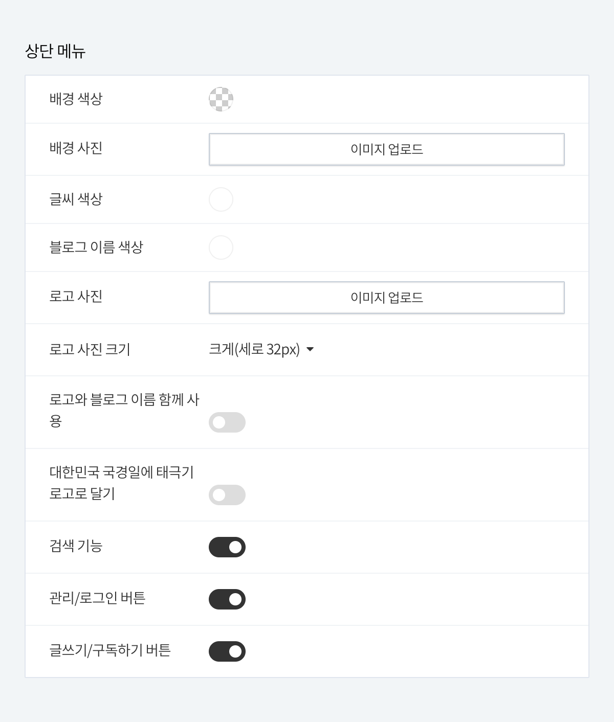 기본 설정 부분의 스킨 옵션들은 다음과 같습니다.